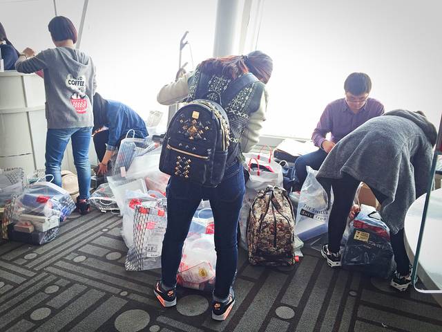 取完货就结束了吗?no~!一开始觉得自己买的太多了,看到其他人发现原来大家都是同类~取到货的人前赴后继地把大包小包摊在地上,核对商品、拆包装、装箱,瞬间有一种大胡同上货的即视感……当然,取到货后,我和妈妈也加入了他们的行列~还好我们有备而来,带了箱子和好几个结实的提袋,才把所有商品顺利收入囊中~至此,上机前所有环节才算圆满完成~我们在本以为时间充裕得能逛遍所有免税店,结果却严丝合缝片刻不留的情况下,终于坐上了返程的飞机……