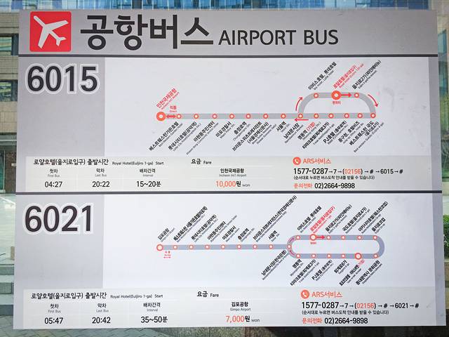 这里是【皇家酒店(Royal Hotel)站】的站牌,里面涵盖了关于机场大巴的几乎全部重要信息,绝对干货~上面的【6015路】是通往【仁川机场】的大巴,回程就是坐的这班车抵达机场~
