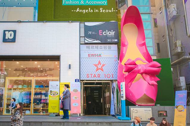 参观完梨大,在附近品尝了【烈凤酱鸡】的特色美味,开始逛梨大门前的这条步行街,那个大号的高跟鞋雕像就是这条街的标志~整条街热闹非凡,美饰美衣琳琅满目,梨大的学生真幸福~