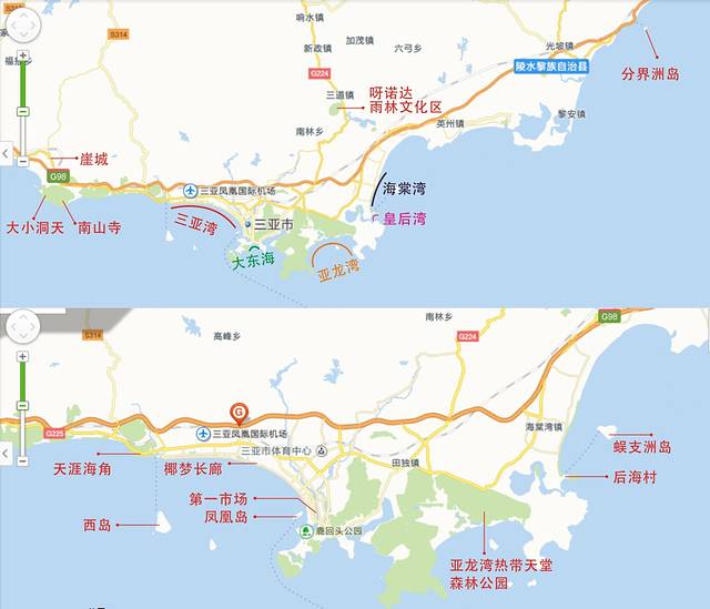 从左至右依次为三亚湾,大东海,亚龙湾,海棠湾,分界洲岛,沿途分布各种景点。看图比较清楚。