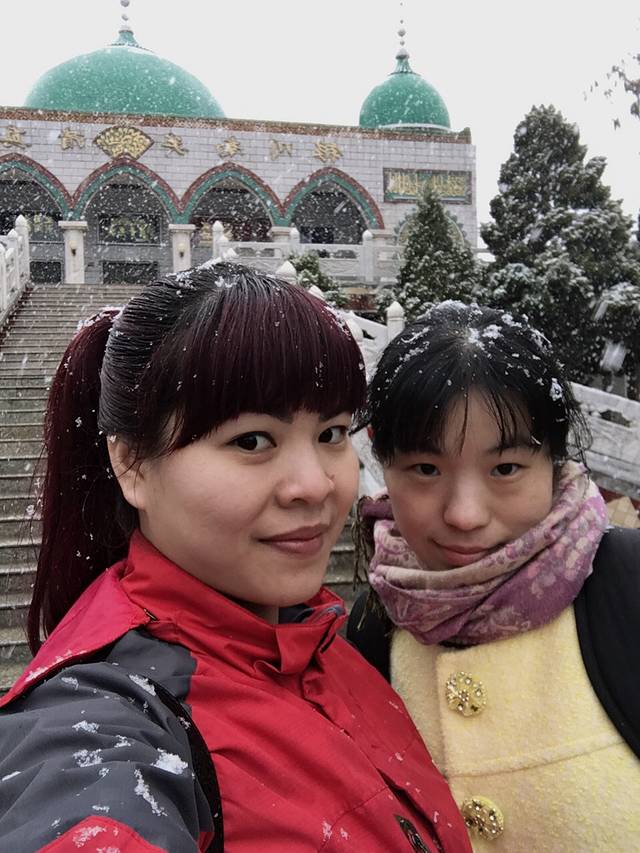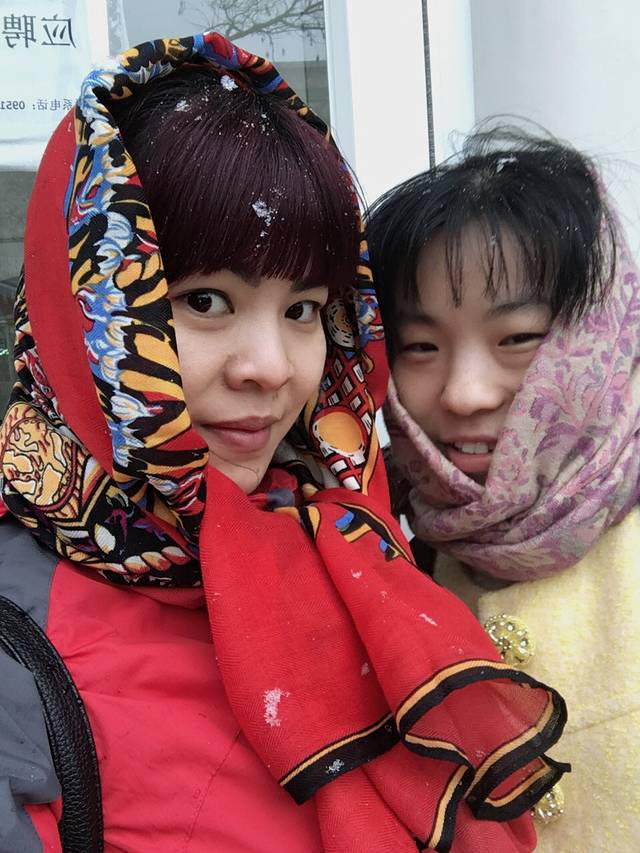还没等吃完饭,天空就飘起了大朵大朵的雪花~两个妹子像难民一样裹起了围巾!