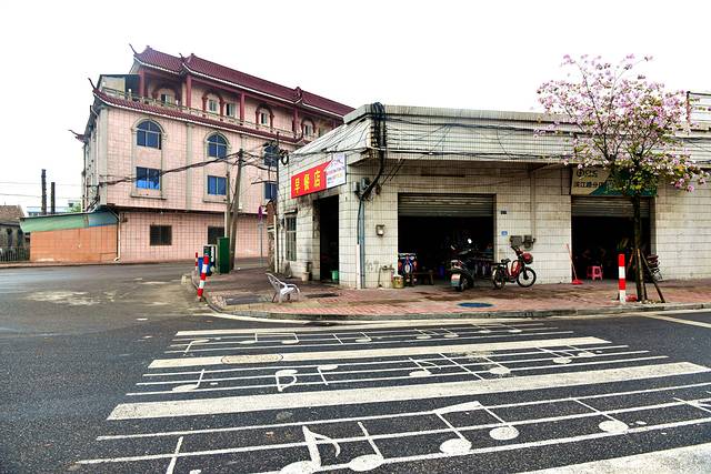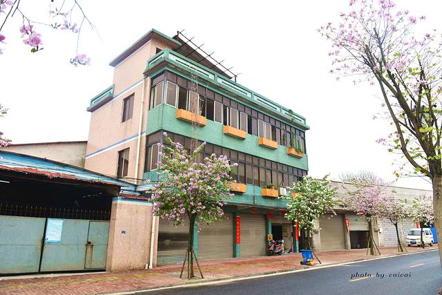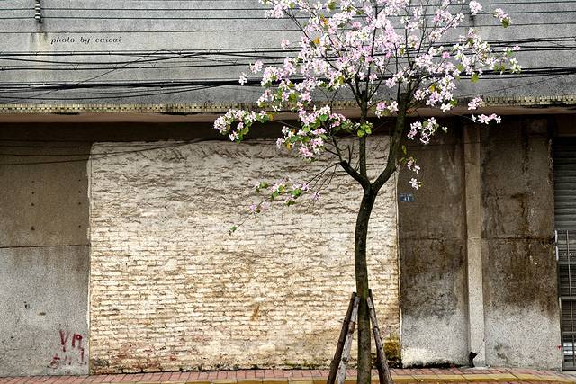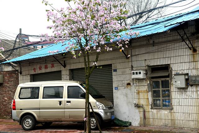 艺术河畔其实由废旧冷冻厂房改造而成的,墙壁涂着各种鲜颜的彩色,另一侧是一些小商铺或者住户,私家车随便的停在划好的地方。据说艺术河畔规划的用途为客栈、花店、博物馆等充满艺术气息的建筑,只是不明白为何一直空着。马路两侧的紫荆花正骄傲地吐露着它的芬芳,招摇着它的身姿,白色的花、紫色的花、粉色的花,一朵一朵拼了命地伸展着。