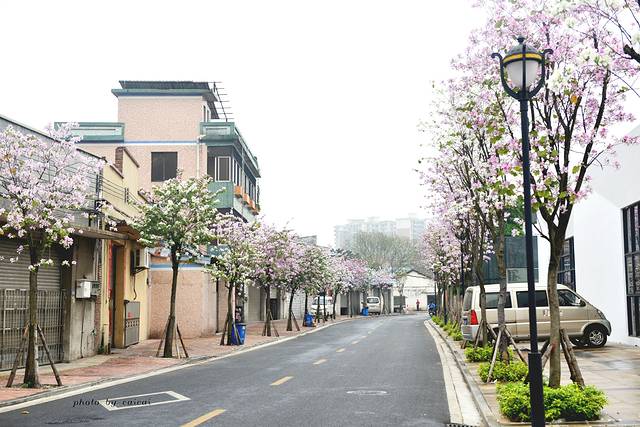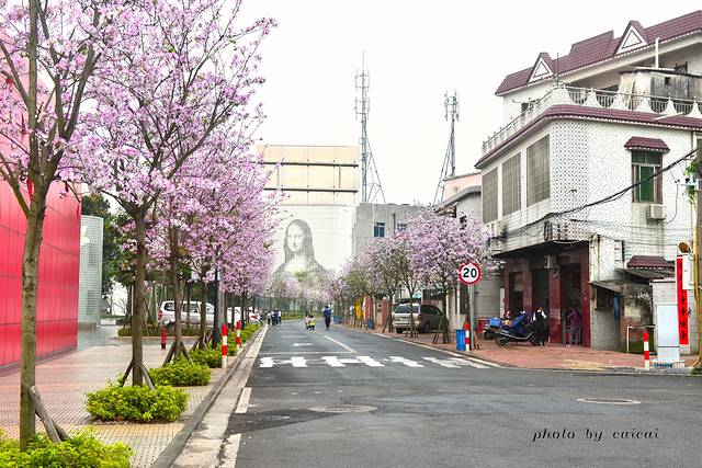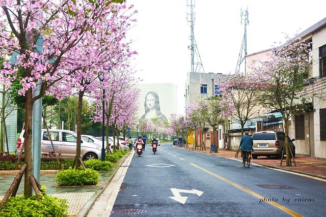 这条美丽的紫荆花道,时而有摩托车经过,时而有私家车开过,时而有和我们一样的赏花人漫步而行,还有一趟里11的公交车。