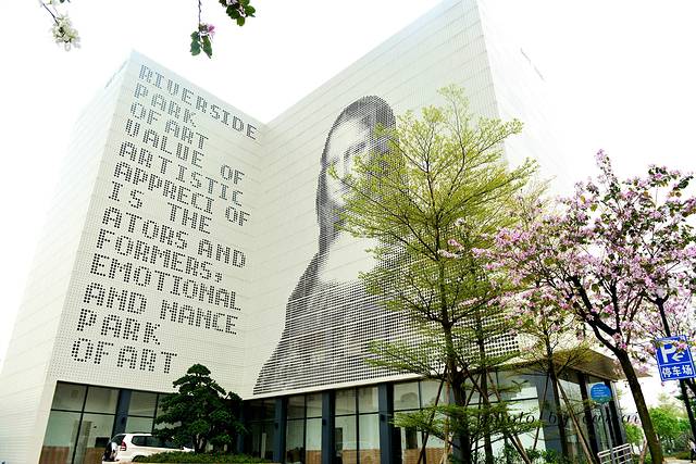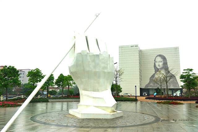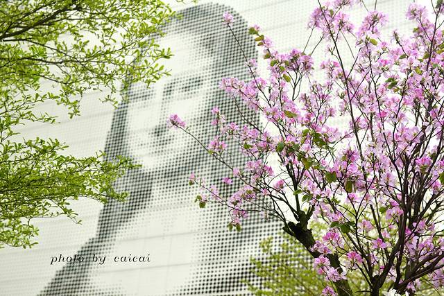 大老远就看见有一处厂房高高的墙壁上印着蒙娜丽莎的微笑,她默默的望着马路和马路上来来往往的行人,以及那开的正高兴的紫荆花,一言不发。