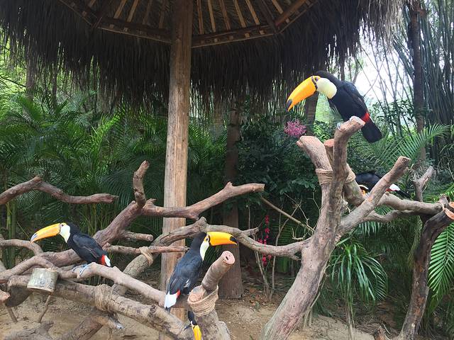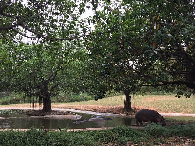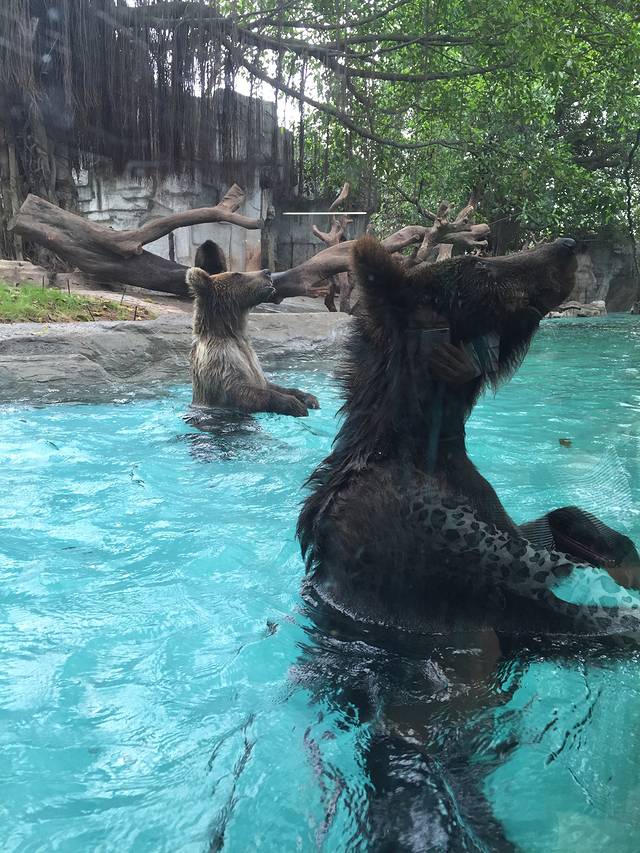 长隆的动物园与北京野生动物园最大的不同,就是植被更多、空气更湿润、动物更自由、更活泼。所见园区,没有高大的玻璃房、没有高围栏,近距离看猴子的区域,也没有被绳子栓着。动物表演很精彩,狗熊跳水、白虎爬树、跳水,大象跳舞,狒狒争食。喂食的也比北京多,食料真心不便宜。感觉这里靠动物把衍生产品赚钱做得更到位。