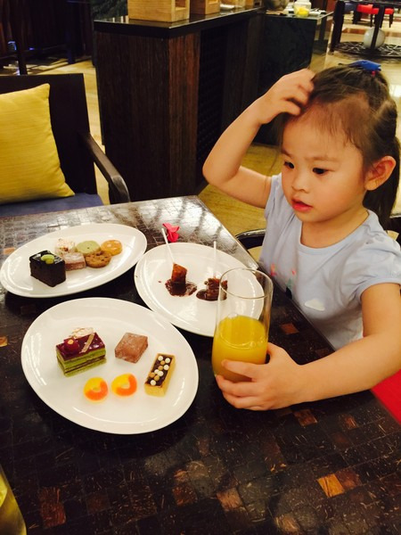 茜茜最喜欢的还是行政酒廊提供的巧克力时间,每天对于茜茜来说是必去报道的,还有每天晚上睡觉前一定要拖着我们带她去拿夜宵,夜宵是在电梯口放着的一个自助台有薯片,零食,软饮和啤酒,咖啡和茶,每次茜茜都拿好多零食回房间吃。对小朋友来说也是新鲜。。