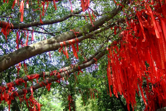 树上挂满祈福的红布条。