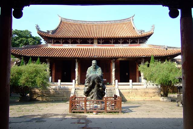 大成殿前矗立一座夫子像,看起来不似古物,不知道有什么讲究,我是觉得里面供奉一座夫子雕像了,外面没必要再立一座吧。