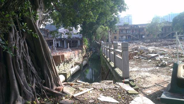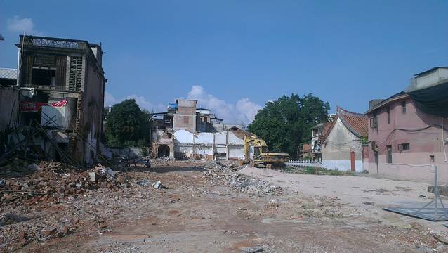 映入眼帘的是彩钢施工围挡和拆成一片废墟的老街。