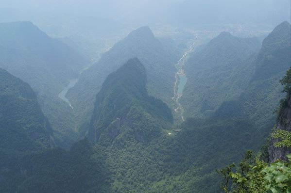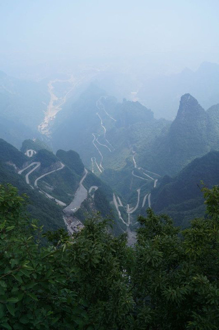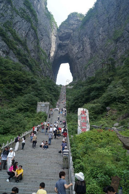 坐索道到中站。经过99道弯公路,二十分钟,到天门洞台阶前。在台阶下仰望天门洞,洞中白雾缥缈而出,真的有天门大开的奇妙和神圣感。爬999级台阶上天门洞。累……到了洞口,另一边是田园风光,宛如真的来到另一个甜美世界的入口。原路坐环保车返回至索道中站,下到门票站已是下午一点多了。