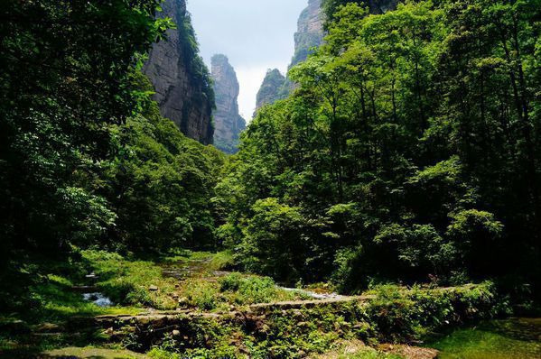 金鞭溪野性十足。金鞭溪是天然形成的一条美丽的溪流,因金鞭岩而得名,穿行於绝壁奇峰之间,溪谷有繁茂的植被,溪水四季清澈,被称为“山水画廊”、“人间仙境”。有诗赞曰:“清清流水青青山,山如画屏人如仙,仙人若在画中走,一步一望一重天”。走近金鞭溪,满目青翠,连衣服都映成了淡淡的绿色。流水潺潺,伴着声声鸟语,走着走着,忽然感到一阵清凉,才觉察有微风习习吹过,阵阵袭来的芬芳使你不由得驻足细细品味。清澈见底、纤尘不染的碧水中,鱼儿欢快地游动,五颜六色的卵石在水中闪亮,不由让人撩起裤管下去捡卵石。阳光透过林隙在水面洒落斑驳的影子,给人一种大自然安谧静美的享受,真是人沿清溪行,胜似画中游。难怪金鞭溪会被称为“世界最美的峡谷”,“最富有诗意的溪流”。