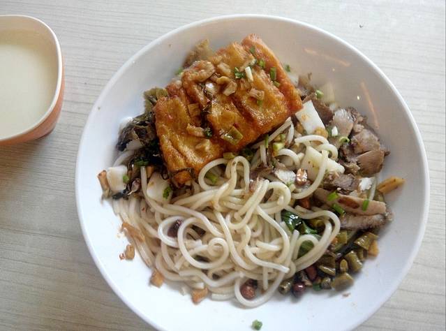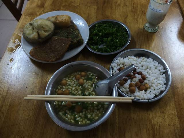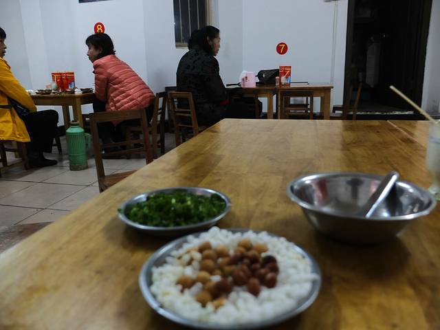 订了中午返回广州的动车票,还有几个小时,于是就到处逛逛,发现了久闻其名的恭城油茶店,里面坐的都是本地人,桌椅都很矮,大概300左右高,坐着很不舒适(大理乡下的饭店也是这样)不管了,先来一份油茶!