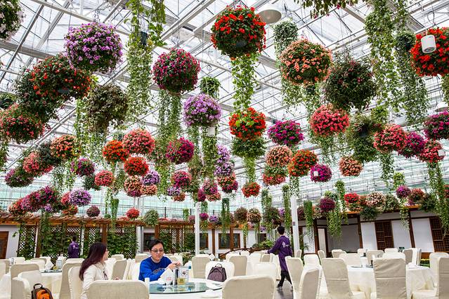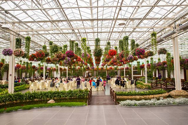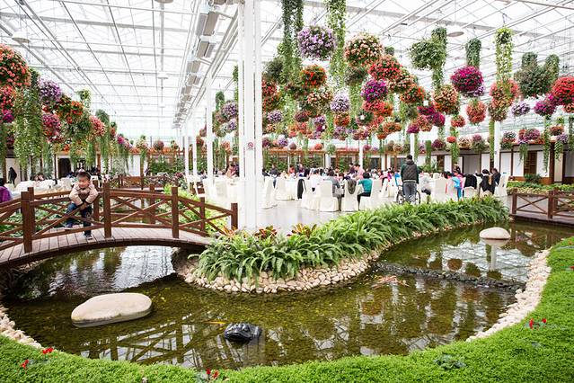 上海鲜花港为了提升旅游产业的服务水准,今年又配套完善了吃、喝、游、乐为一体的“花飘四季,如梦花港”的大型多功能“以花为景”的花园餐厅,在此届郁金香花展上首次向广大游客亮相。总面积20000平方米的智能化温室内设有5000平方米的花卉超市,5000平方米的花园餐厅,10000平方米的水生花卉、垂吊花卉休闲园。