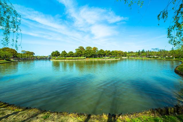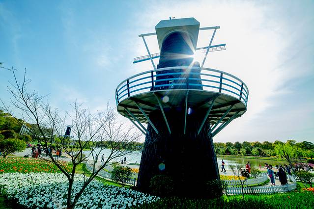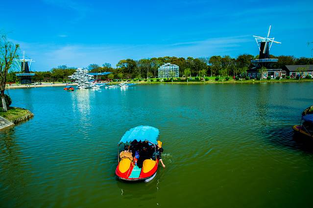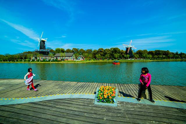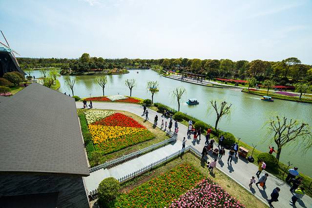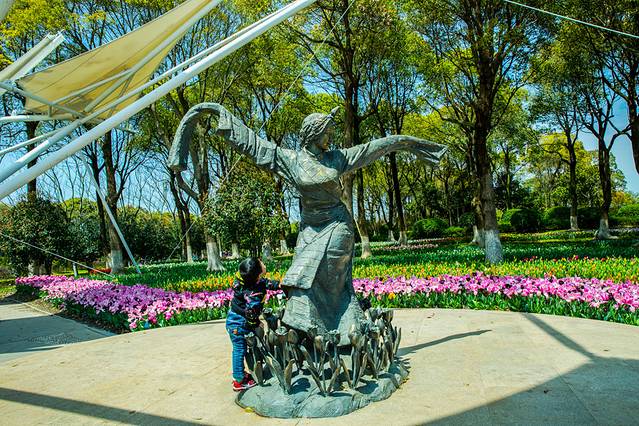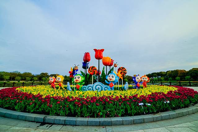 展示园中碧绿的湖水像颗宝石镶嵌在花海中,映着蓝天、白云,群鱼雕塑与参天绿树,秀河与花海,宛如人间仙境。上海鲜花港今年首次引进了一百多个荷兰新品郁金香品种,在50公顷的新品展示园内齐聚绽放。