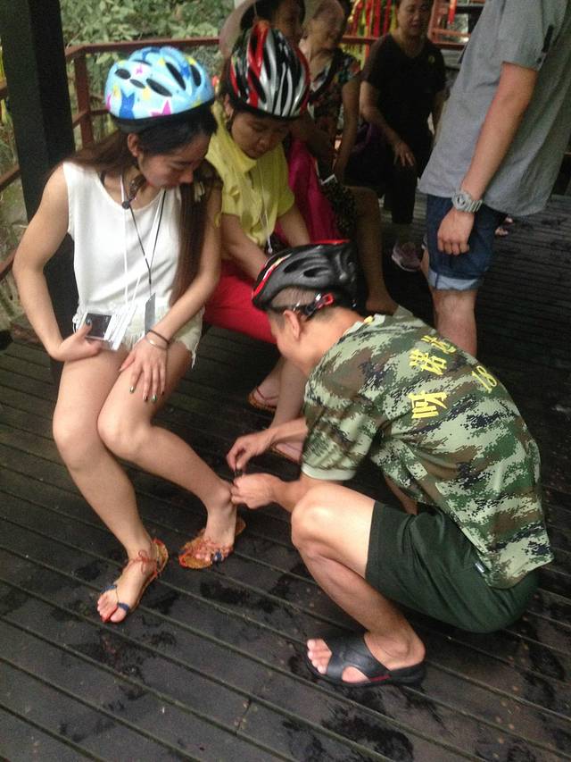 我们那一组的教练是个非常nice的小伙子 一路有说有笑 大家都玩得相当happy 我朋友鞋子打脚 脚上很大一块伤口 他还细心的找了草药给我朋友敷上 关键是特别有效 两三个小时后草药取下来整个伤口看起来都好了很多