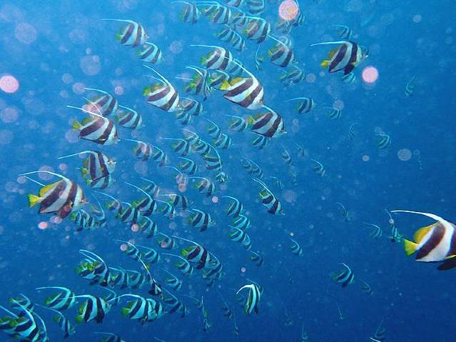 除了扁扁的热带鱼,其他小鱼都非常敏感,相机一靠近就逃跑了。