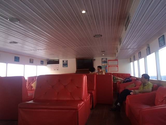 我们买的头等舱船票在大船第二层,舱内视野比较开阔,都是很大的软皮沙发,人特别少,一人占一个沙发躺在上面睡觉,简直不能再好了。头等舱吧台酒水小吃免费,可以随便拿,还有免费晕车晕船药,效果棒棒的,我往返都吃,完全没有晕船的迹象,而且大船比较平稳不像小船晃荡得厉害。船顶的那个甲板只能从头等舱上去,所有几乎没人,360°视野,只是风太大,吹一会就受不了。如果晕车晕船的人,还是建议多花钱坐头等舱,安稳睡一觉就到目的地了。船内空调很冷,一定要带外套!