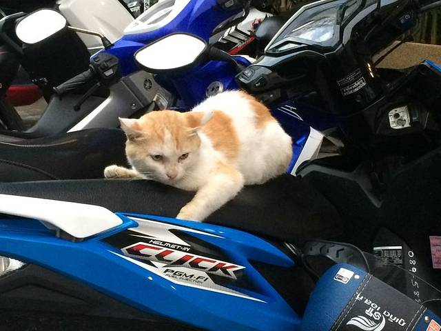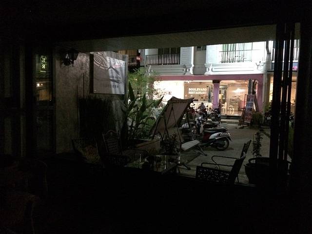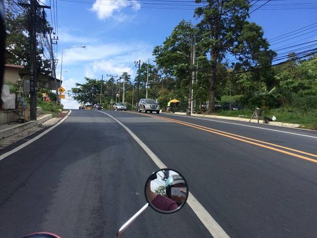 14:00,用谷歌地图找好六号餐厅(No.6 Restaurant)定位,车哥载着我歪歪斜斜的出发吃午饭去。 嗯,技术真的奇烂无比,而且泰国交规是靠左行驶,我们不太习惯,所以刚接手时安全起见我不让车哥超车、不让像其他人一样把车骑在汽车和人行道之间(距离太窄,怕他技术不好撞到行人或汽车),就跟在一两汽车屁股后面走就是了(这才知道国内那些摩托东插西插还是很需要技术的)。说起来我们骑了这些天没出什么事故,也是归功于泰国人民都礼貌行车,并不像国内那样风气不好的别来别去,随意换道,而且汽车对于摩托和行人都非常礼让。
