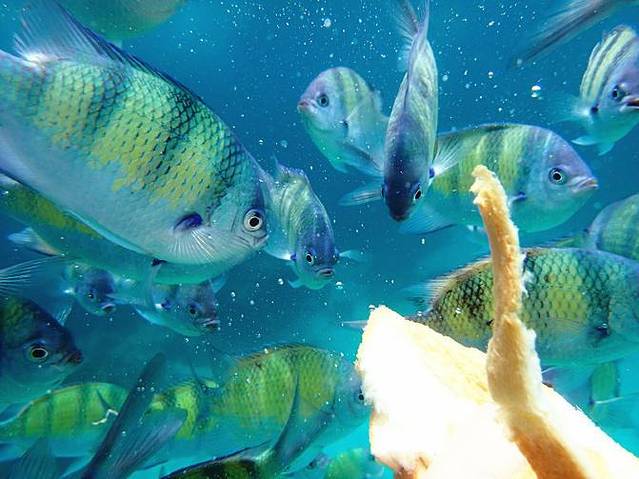 离岸边还有6、7米的时候,水清得已经震惊到我了,船家把船停下,告诉我们在这里浮潜。长尾船一停,不停随着波浪来回摆动,分分钟我就开始晕船想吐。实在恶心的下不去水了,只得让车哥带着我们装在防水套里的相机先去试试水。结果这个猪一样的队友5分钟左右就浮上来,把相机交给我开始当甩手掌柜不干了。说是他也被船晃得不太舒服,我们没有租有度数的潜水镜,他在水里不太看得清东西,况且他第一次来普吉已经浮潜过了,现在说什么都不肯再下水,关键时刻男人真不靠谱!作为中国人我可是时刻谨记我们的终极宗旨,来都来了!只得忍着剧烈想吐的感觉,进行人生中的第一次浮潜。这时候又一次想问候车哥他全家,妈蛋!我拿来吸引小鱼的面包被车哥趁我不注意的时候全给吃光了。