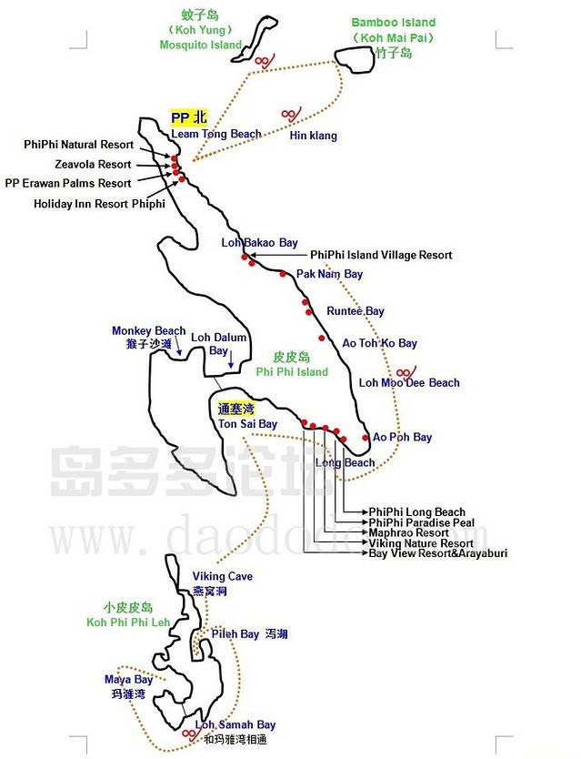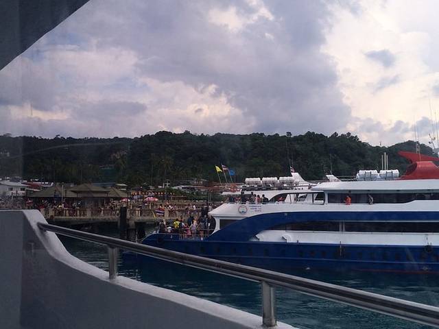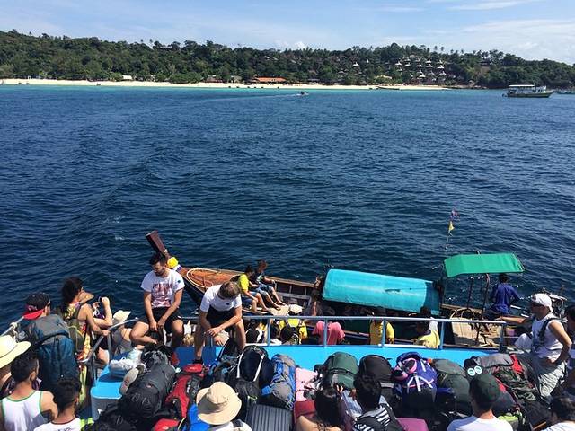 到达皮皮岛后,共有三个站点可以下船:第一站通塞湾(Tonsai Bay),约2小时行程,大多数人会在这一站下船,第二站Long Beach,少部分人住这里,清净很多,沙滩远观也还不错,大船不靠岸,酒店会派长尾船来大船边接客人,约2小时20分钟。最后一站Leamtong Beach(蓝通海湾),也就是皮皮北部,也是我们此行的终点,总行程共3小时。因岸边水浅大船无法靠岸,同样是酒店的长尾船来接人