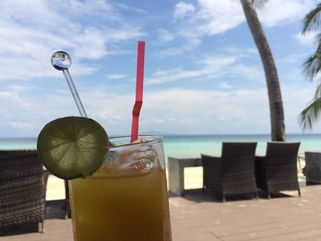 早饭过后,11点左右回房间把行李收拾好,将钥匙交给前台退房。行李留在房间里不用带走,到时候会有工作人员把行李运到船上。很快办完退房手续,想起来还有两张免费的饮品劵没用,来到海边吧台兑换了两杯果汁坐在海边静等1点小船来接(本来是不限饮品价格,我和车哥都不约而同选了最便宜的果汁怪不得没有富贵命哈哈)