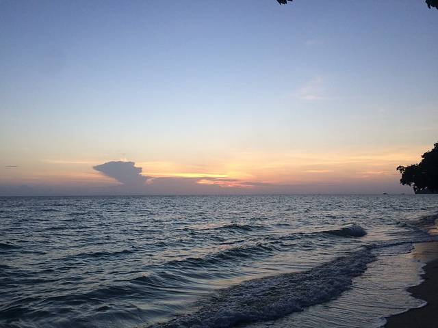 有幸住一次离大海最近的房间,怎能随便浪费,一定要起来看一次海边的日出呀!查了第二天日出时间大概是在6点20左右,5:40我就挣扎了起床(车哥为了懒觉残忍抛弃了我),慢慢梭到沙滩边上,空无一人,也没有太阳。想是离升起还有一段时间,又缩回被窝眠了一会。再次被闹钟叫醒已经6点10几分,奔到岸边一看,太阳已经躲到海岸线那边的云层里了看日出计划华丽丽失败