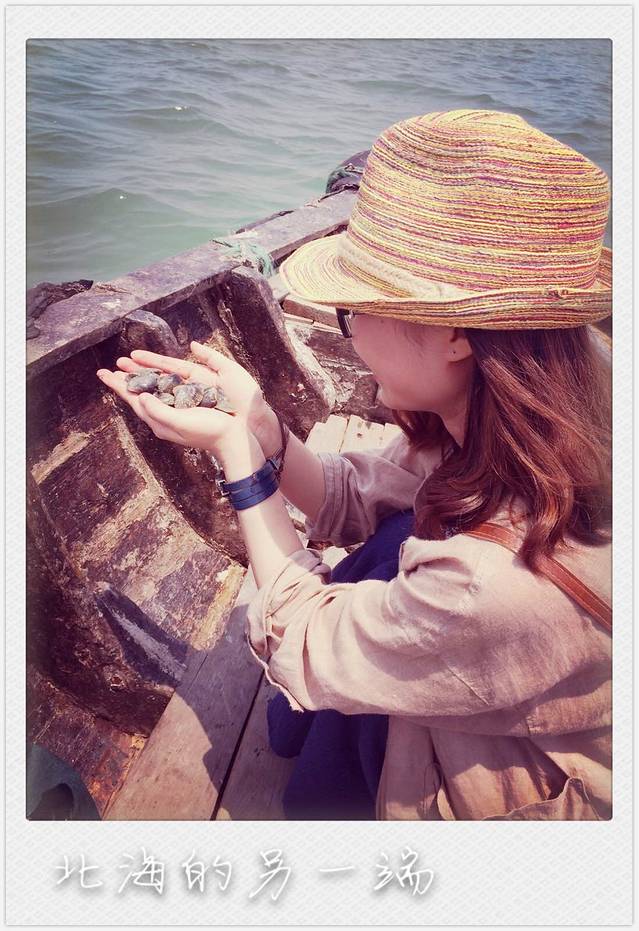 在船上,我们看到有一对夫妻在打捞海螺,我们就跟渔夫说,我们可以问他们拿几个吗?我们靠过去去,船夫一直介绍说我们从哪里来,想拿几个海螺。船上的女人给我们抱了一堆过来,我捧在手心,心里想着因为他们的善良,大海才会如此的馈赠他们。