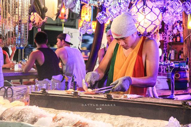 小哥忙着给各种海鲜翻身烧烤。