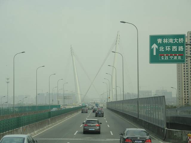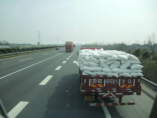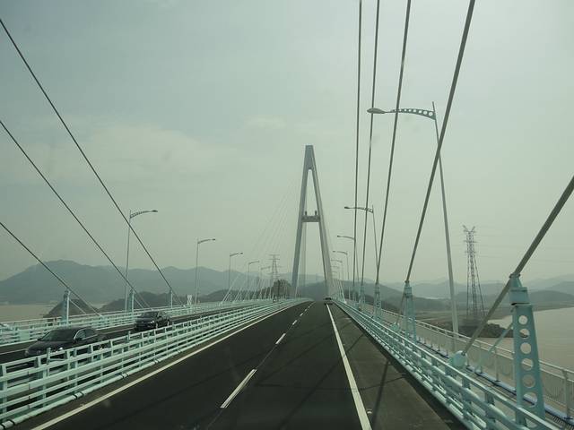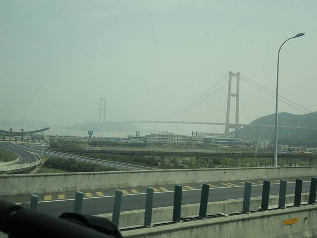 我们乘坐是所谓的“高大二”车型的客车,就是乘客坐在相当于北京观光大巴二层的位置,我们买的票里有一张是第一排右边的,是个看风景的好地方,自然就留给家庭摄影师紫檀同学啦。大巴车上一切顺利,车窗外的风景有些单调,再加上海面有雾,也没什么可看的,随便拍了几张照片: