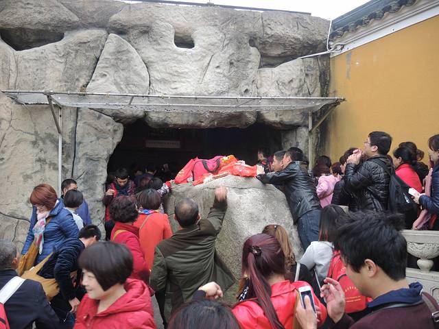 法雨寺整座寺庙宏大深幽,气象超凡,据说是皇家寺院,果然名不虚传,虽然路途稍远,但还是很值得去游览一番的。至此,我们今天的游览计划已经完成了,还不到15:00点。紫檀很想在法雨寺吃一次斋饭,但法雨寺要到16:30才开饭,要等很久呢。此时,岳母说要去梵音洞。天呀。这可是一个计划外的项目呀,而且梵音洞离法雨寺相当之遥远,喵喵立刻说那就坐游览车去,并立马抬脚走向游览车站去排队了。 老两口看来也是累了,并没有坚持要步行前往,而是跟着喵喵来到了车站。法雨寺到梵音洞的车票是10元/人,十分钟的车程就到了。下了车还要步行一刻钟才能到达梵音古洞的大门,到了门口,喵喵明确表示不再走了,就在门口的亭子里等待我们;老两口也不太想走长路了,只在门里的庙里拜拜就可以了。紫檀心有不甘,花了40元来到这里,进门口溜一圈就走,太亏啦!于是鼓起勇气,决定独自走一遭了。梵音洞里有两处景点:善财洞和梵音洞。看路牌显示,善财洞只有430米,但事实再次证明了普陀山上对距离的评估是多么的不靠谱呀!崎岖狭窄的山路,高低不平,长度最少也又2500米,累得个半死来到善财洞,这里的人气倒是超高,一个山洞口外挤满了手里高举着数张百元大钞的男女们,不知为什么都在往洞里挤。绕到后面一看,吓了一跳,这后面还有几百人在排队等着往洞里拥呢。不想知道他们在干什么,也没工夫傻等了,紫檀立刻转身打道回府了。