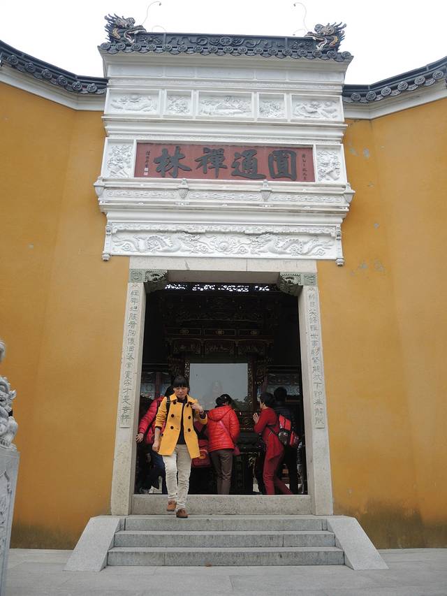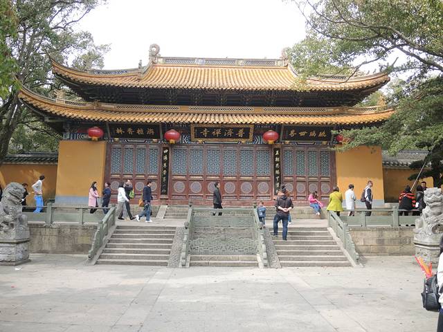 葱茏的参天大树掩映间,一带黄色的围墙,这里就是著名的普济寺了。