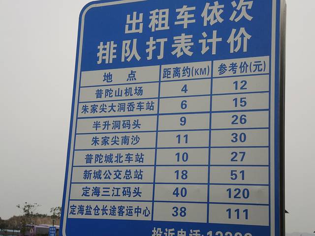 就因为这4公里的路途,我们还差点和当地出租车司机 干了一仗。事情的经过是这样的:离开码头,在车站的一家快餐店吃了一顿又贵又难吃的快餐后,我们来到出租车停靠点打车去普陀山机场。这里的牌子上明明写着离普陀山机场4公里,12元,可出租司机非要25元。和他交流了好一会儿,他说最少要20元。这时一个管理员模样的人看到我们在这里争执,就走了过来。司机一看,关上车门开走了。管理员问了一下情况,紫檀据实相告。他问是否要投诉司机,紫檀反问:如果投诉,司机会受到怎样的处罚?答曰:至少罚款500元。紫檀一听,恻隐之心顿生,当即决定不投诉了,毕竟一个出租司机出来挣点钱也不容易,得饶人处且饶人吧!不知为什么,中午这里几乎没有出租车,幸亏我们不是急着赶路,否则不就耽误事儿了!管理员建议我们去坐机场大巴,一问价钱:7元/人,四位28元,比打“黑车”还贵了8元。喵喵倒是挺正义地说:宁可多花点钱,也不能助长这种歪风邪气!您倒是正义了,可我的钱包却受到了损失呀!在大巴车上等了将近半个小时才开车,其实就是直行一分钟,再调个头,前后5分钟的事儿,按照距离计算,这里的机场大巴比北京的大巴可贵多了呀!