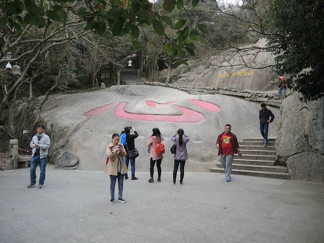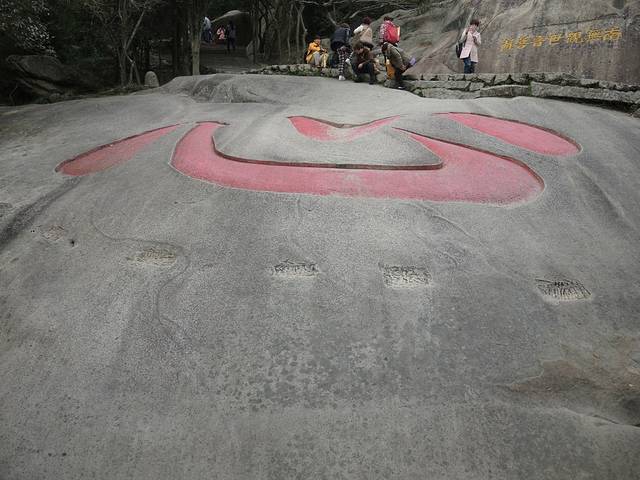 首先看到的是心字石,巨石之上用朱漆描就的一个巨大的石刻汉字——心。与此“心”字合影者甚众。