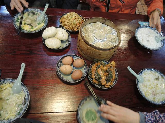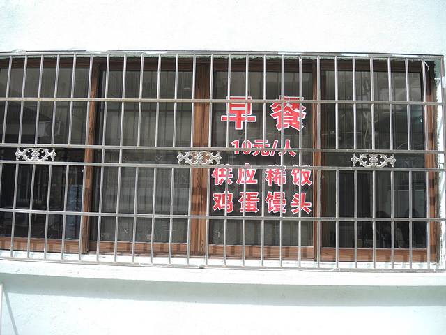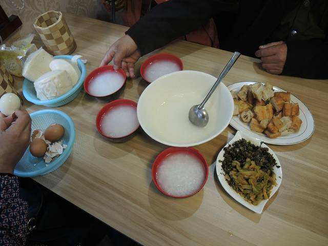 7:55,紫檀提前5分钟赶回了客栈,大家都已准备停当,带好了饮水和零食,就等着紫檀回来一起出发了,他回来得正是时候。到楼下的小饭馆里去吃早饭,一路上几家饭铺的价格都是一样的,我们随便找了一家有空位子的进去。每位十元:每桌油条一盘(由两根切成),煮鸡蛋每人一个,咸菜一碟(不够可添加),馒头和稀粥不限量,吃饱为止。
