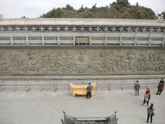 金身铜像的后面有一座巨大的浮雕照壁(也许是影壁)——大士海会,场面宏大,雕刻精美。