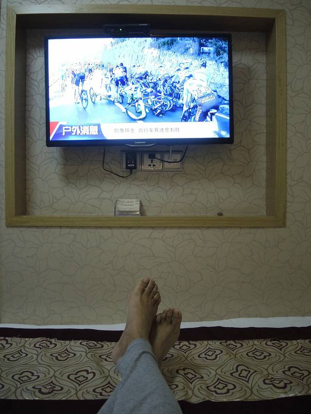 这是家庭房里的大床,紧卡在三面墙壁中间。平板电视机就挂在我们床脚的墙壁上。房间的确是够小的,床的长度就是房间的纵深,看电视就得受点委屈了,得靠坐在床头,让视线越过自己的脚丫子投向荧屏,好在脚趾头不像眼睛一样怕辐射,不过,眼睛的余光总能带到自己的脚趾头。