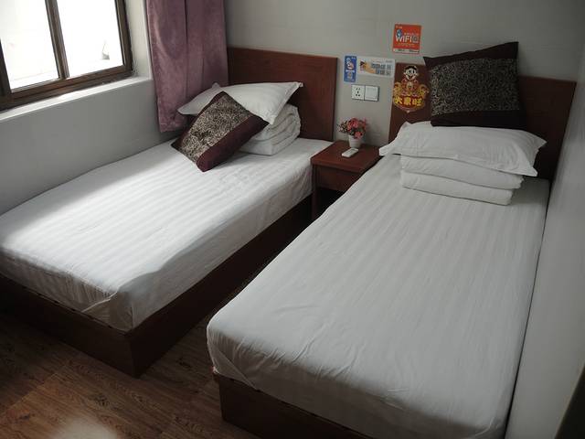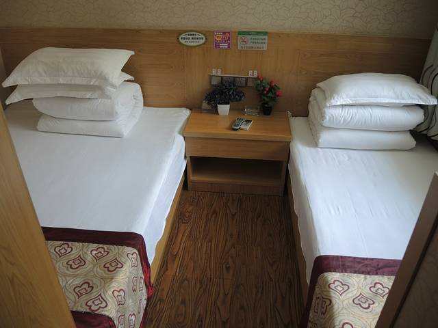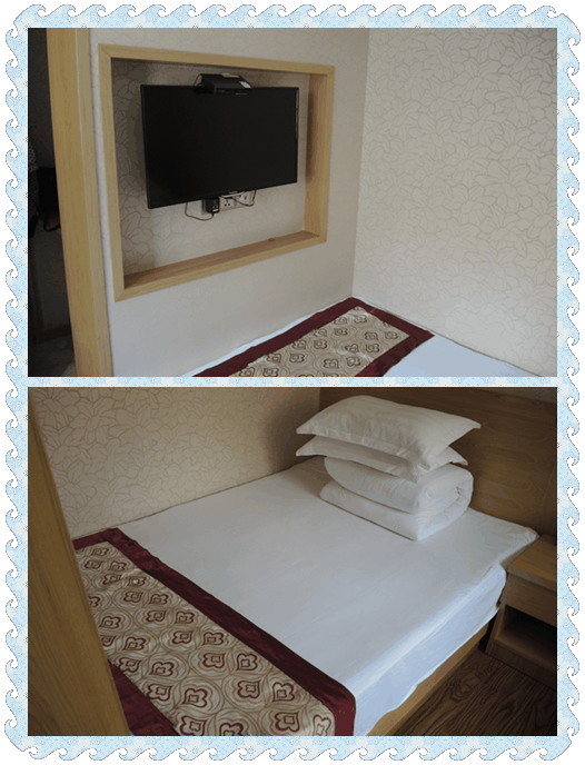 我们预定的客栈在西天景区附近,离码头还是很有一段距离的,步行20分钟左右 。客栈就是由小区里的居民楼改造而成的,其实这里大多数的居民住宅都已经改造成了家庭客栈,一个个的二居室、三居室、N居室里的每个房间稍加改造和隔离,分出一个卫生间,就成为了一个个独立的客房,随后就能开门迎客了。我们订了一个标准间给老人,一个大床房给我们,可是老板说大床房临时没有了,我们有些不悦,还没来得及表示不满,他就已经果断地决定将我们预订的大床房免费“升舱”为一间家庭房,就是一张大床+一张单人床。我们看了房间,觉得还不错。原本打算在客栈订餐的,可惜他家的厨师走了,没法订餐了。我们从众多的攻略里了解到普陀山的吃和住可不是一般的贵呀,于是就想请老板推荐一下哪里有价格比较合理一些的饭馆可供我们选择。他有些为难,只是说楼下的饭馆会比景区的便宜一些,具体哪一家就不便详细推荐了。我们也不好强人所难,只好作罢了。客栈的房间很小,逼仄紧凑是这里最明显的特征,好在设施齐全,住起来也还算舒坦吧 。尤其是有一台给力的冷暖双制式的空调,让我们在3月份的阴雨连绵的海岛上不用忍受阴冷潮气的折磨了 。