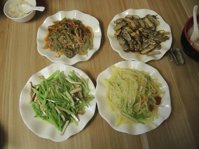 唯一的荤菜是辣炒文蛤,25元。这里的海鲜是够新鲜的,每一只文蛤都是大张着嘴的。厨师的手艺不错,味道很鲜美。