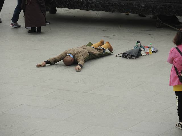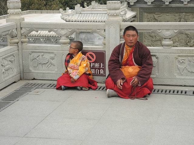 在通往南海观音铜像的紫竹路上,可以看到不少三步一叩首的虔诚香客,期间,紫檀还看到了一位年纪不小得大和尚,在徒弟陪同下,一路磕着等身长头像观音菩萨的金身塑像前行。