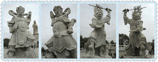 观音菩萨身前伫立着四大天王,威风凛凛地护卫着莲台宝座上的观音菩萨。