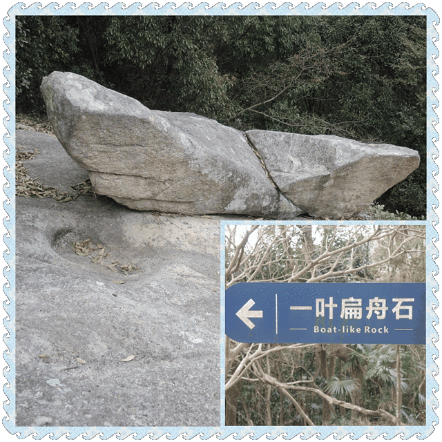 从圆通寺出来往下走一点,有一块大石如一叶扁舟静卧于山崖上,这就是“一叶扁舟石”。