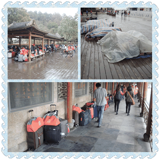 游客们都出去玩了,行李都由客栈的伙计们照看着。为了不跑冤枉路,早上出门时就都带到了码头,一堆堆的放在广场上,雨天则用塑料布苫上,还有的就放在长廊里避雨,反正保管得很好就是了。我们有些后悔没有把行李直接带到码头来。可转念一想,早上没有找到老板,另外就两个包包,也不好意思麻烦人家派一个专人来看护呀。还是自己回去取吧。