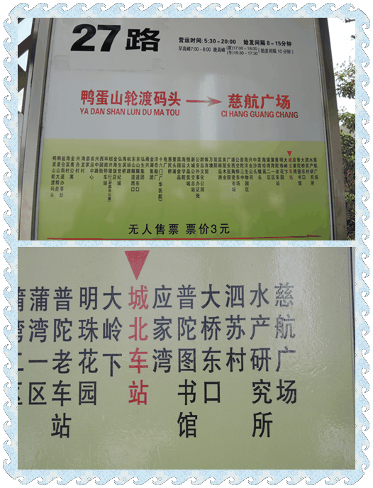 出了车站大门,马路对面就有直达码头的公交车:27路坐到终点慈航广场,3元/人。