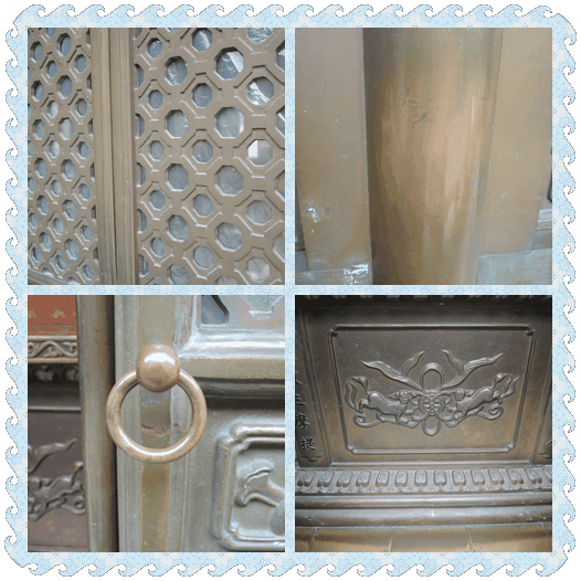 铜殿里的门、窗、墙、柱都是用纯铜铸成的,名副其实,而且工艺精美。