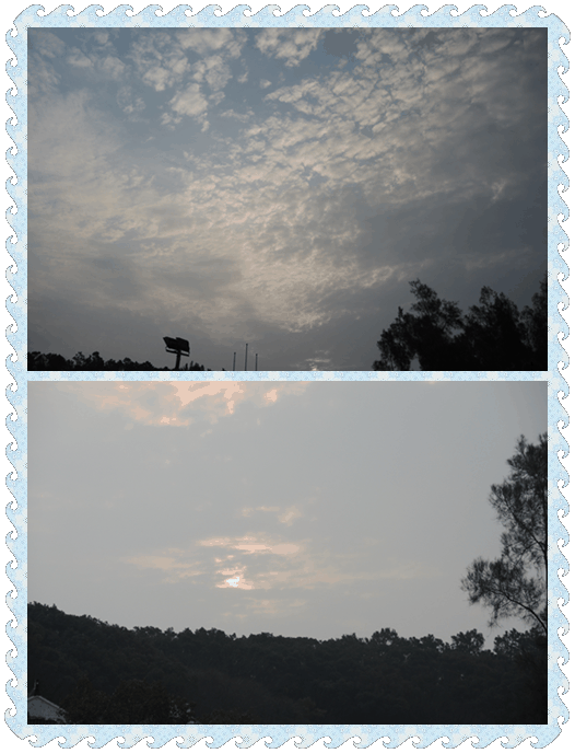 抬头望望天空,多云的样子,有一些蓝色的天宇出现在云朵之后。再看看山后太阳即将出来的地方,浓云密布,看来今天的日出不一定能拍到了。