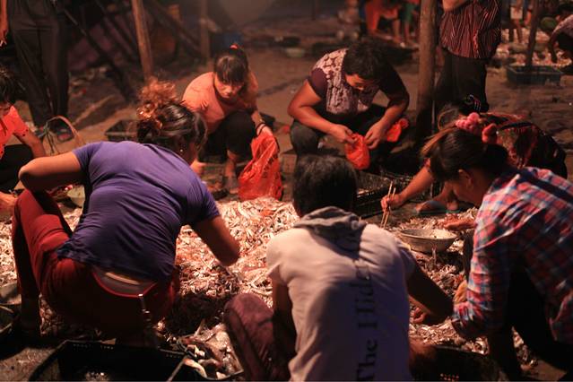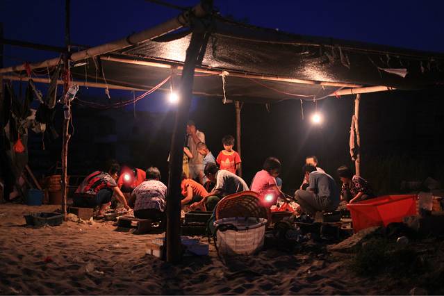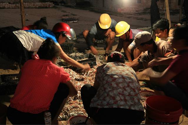 渔民们在海边家门口简易大概的棚子下分拣打捞上来的鱼虾
