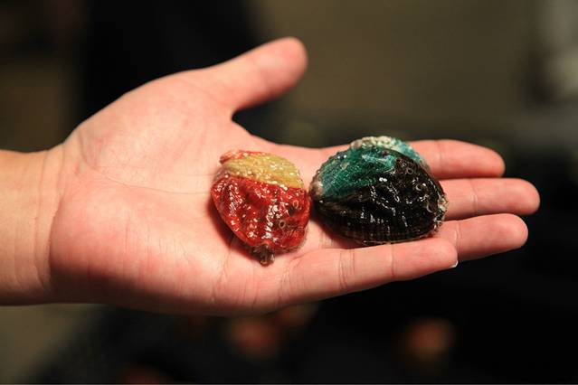 南日岛的鲍鱼养殖以浅海网箱为主,我手上的鲍鱼大约有半年大,通过它壳上的颜色和鱼道就可以判断的它吃的是什么食物,右边这个明亮的绿色说明它吃的是海带,左边这个鲜红说明它吃的是一种红藻,这种红藻较为稀有,成本高,所以这种红色的鲍鱼身价不菲,在一般市面上也鲜见。