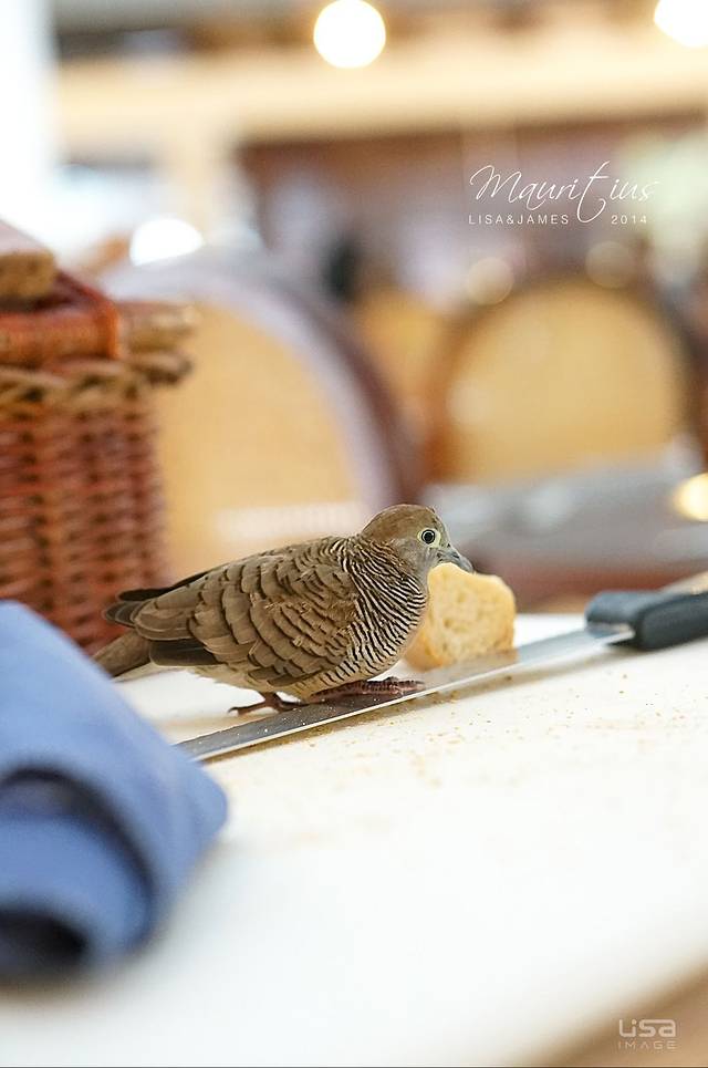 餐包边有一只小鸟,在吃面包屑,一点也不怕人,可爱!