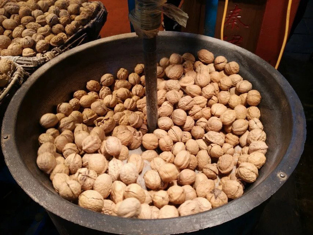 第二天的上午时光加晚上夜晚时光都是在回民街穿来穿去中度过的。晚上这里更有感觉,两边店家的吆喝声,川流不息的人群,我想这是西安最热闹的地方了。两边的美食和小吃看得我目不暇接,各种流口水,只是我这肚子不争气,才吃了几样东西就饱的不行了,可还是想吃到停不下来,直到实在吃不下去还是不罢休,硬是又买了铁板豆腐,烤鱼羊肉串、桂花糕等几种食物带回去。 这次和去厦门曾厝垵的美食街不一样,那边大部分是海鲜美味,回民街这里面食比较多,在北方出生长大的我,对面食更是情有独钟。 排队最长的就是刚进回民街走 不远的右手边的老白家肉夹馍15元/个,里面全部是肉哦,嘿嘿。羊肉泡馍也有几家,选择了其中一家味道还不错,这个馍是需要你自己掰成很小很小的小块,拜好后拿给服务员,她就会给你端来一碗美味的羊肉泡馍啦,有普通和优质羊肉泡馍,价格是在30元左右。枣泥、杏仁、芝麻等口味的糕点,有几家“麦芽糖与花生的故事”店铺,还有腰果酥、伍仁酥、芝麻酥、核桃酥等用便盒装起来便于携带的甜品,这些甜品价格也不贵,只是我很少吃甜品。看着核桃在锅里咕噜咕噜的转来转去,不同口味的核桃有着不同的明码标价。这条街上烤羊肉串的最多,10元/串,用很粗的木签(差不多可以说书木棍了)串起来的,撒上孜然辣椒粉,真是好吃到不行。桂花糕是2元一小块,5元就给三块了,这个桂花糕要趁热吃才好吃。铁板烧豆腐和凉粉是10元/份,酸奶是不同口味不同价格,石榴汁和梨汁好像是5元/杯,喝完忘记价格了,另外还有卖柿饼、山楂、大烧饼、其他各种看起来就想吃的美食,吃不下那么多东西,我还是可以拍拍照滴,嘻嘻。