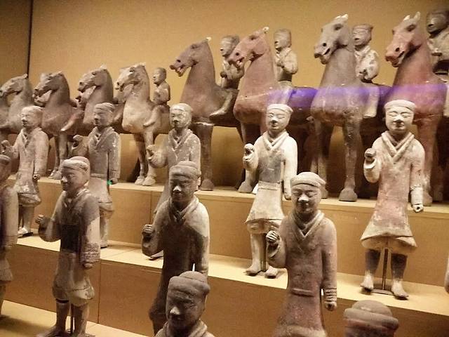 自由行最大的好处就是睡到不想睡再起床,嘻嘻。这也是我喜欢的旅游方式,不赶时间不着急,不管去哪儿最喜欢步行着随意游。起来在房间内磨蹭到11点出门去吃午饭,吃完午饭直接去了陕西历史博物馆。陕西历史博物馆门票是提前一天在网上免费预约的,周一闭馆谢绝参观的,冬季参观时间是9:00—17:30(16:00停止发票),夏季参观时间8:30—18:00(16:30停止发票),到博物馆时领取了门票就开始历史文物之旅了。 进去后就一阵香味扑鼻而来,原来是两边栽种了好大好大的海棠树,正值海棠花开的季节,好多游客在这里拍照写下自己的愿望系于海棠树上,树下是飘落的白色花瓣。两边都有休息的长廊,坐于长廊下闻着淡淡的花香舒服到不可言喻。 其实我是史盲,来博物馆是想看一下那些震撼人心的文物,尽管我不知道它们出于何时生于何地。这个历史博物馆以时代为序,将陕西古代史分为史前、周、秦、汉、魏晋南北朝、隋唐、宋元明清七个部分,我是从一楼的隋唐时代开始转的,有我见过的铜钱和织布机,在我上初中的时候我家里还有中间是方形的外围是圆形的铜钱,织布机我记事的时候我们家已经不用了。最让我欢喜的就是泥塑了,有十二生肖泥塑、哼哈二将、古代舞女、兵马俑等各种泥塑,还有各种人物和动物的泥塑,有些泥塑的神情雕刻的惟妙惟肖,跟真的一样十分生动。墙上的壁画堪称神功,另外还有各种古代使用过的器具以及古墓的仿造。在一楼还有3D放映观看历史文化,那个是重复播放的,如果时间充足还是可以坐着边休息边领略历史文化。 在里面差不多逛了一个小时就离开了这个载有历史痕迹的博物馆。